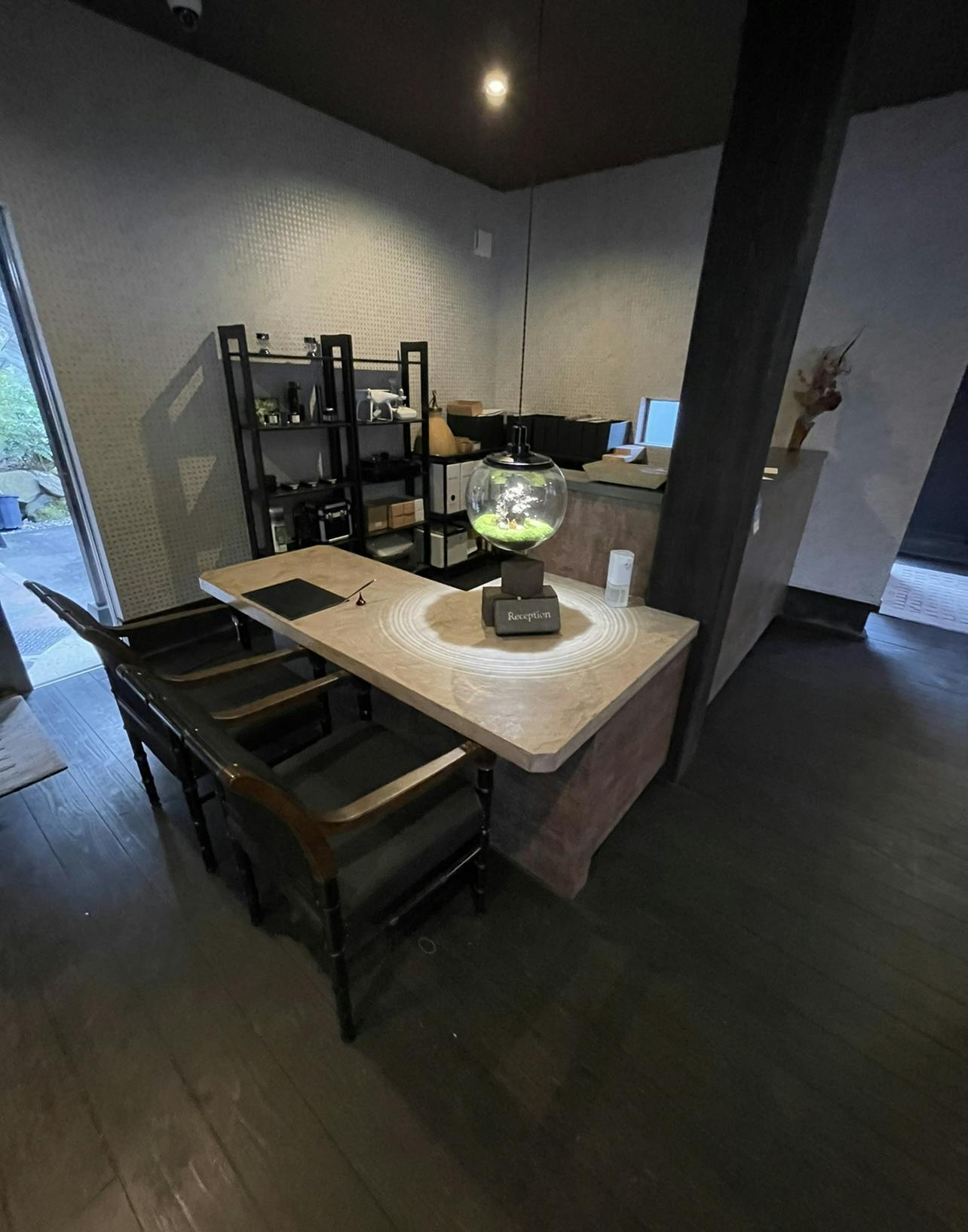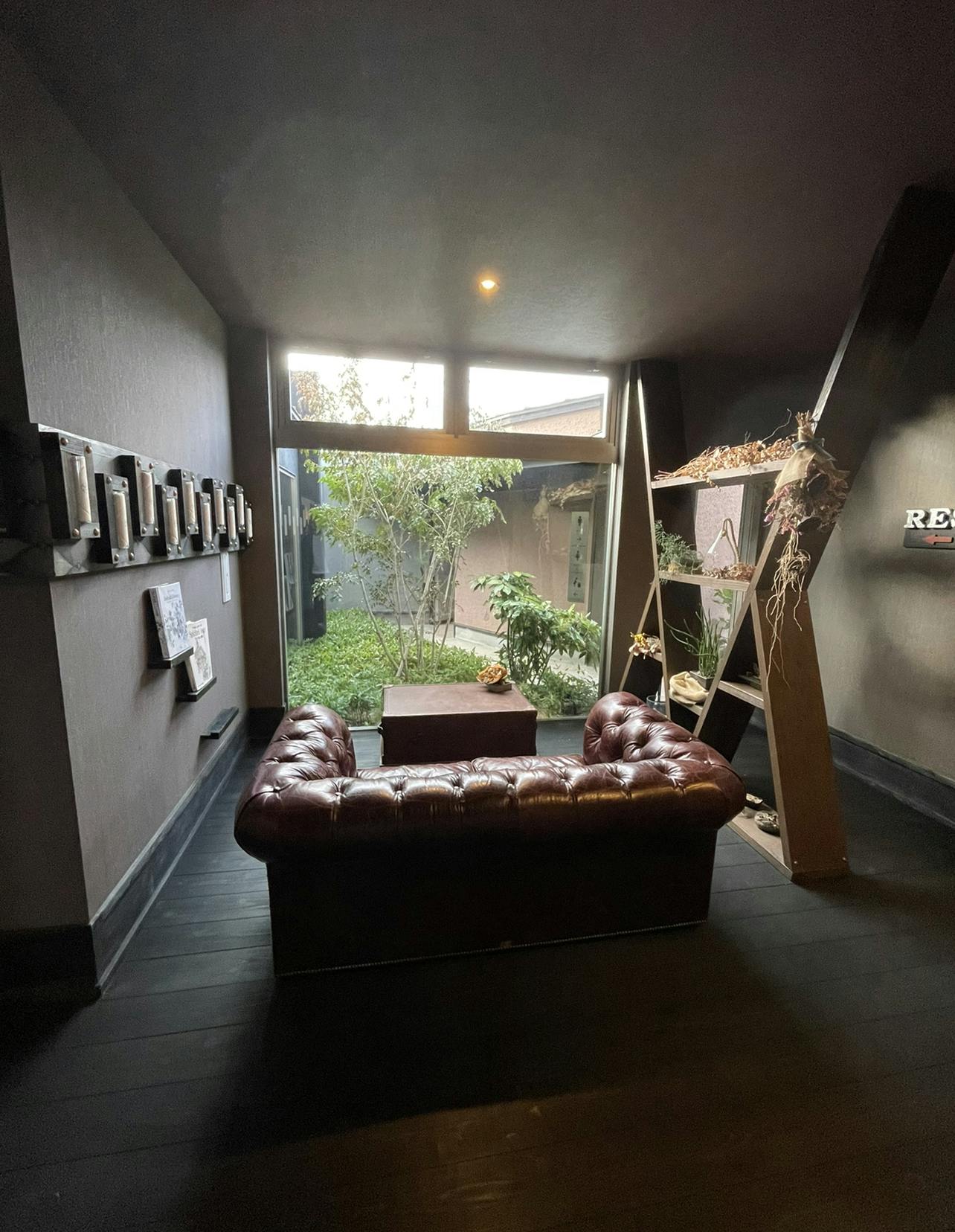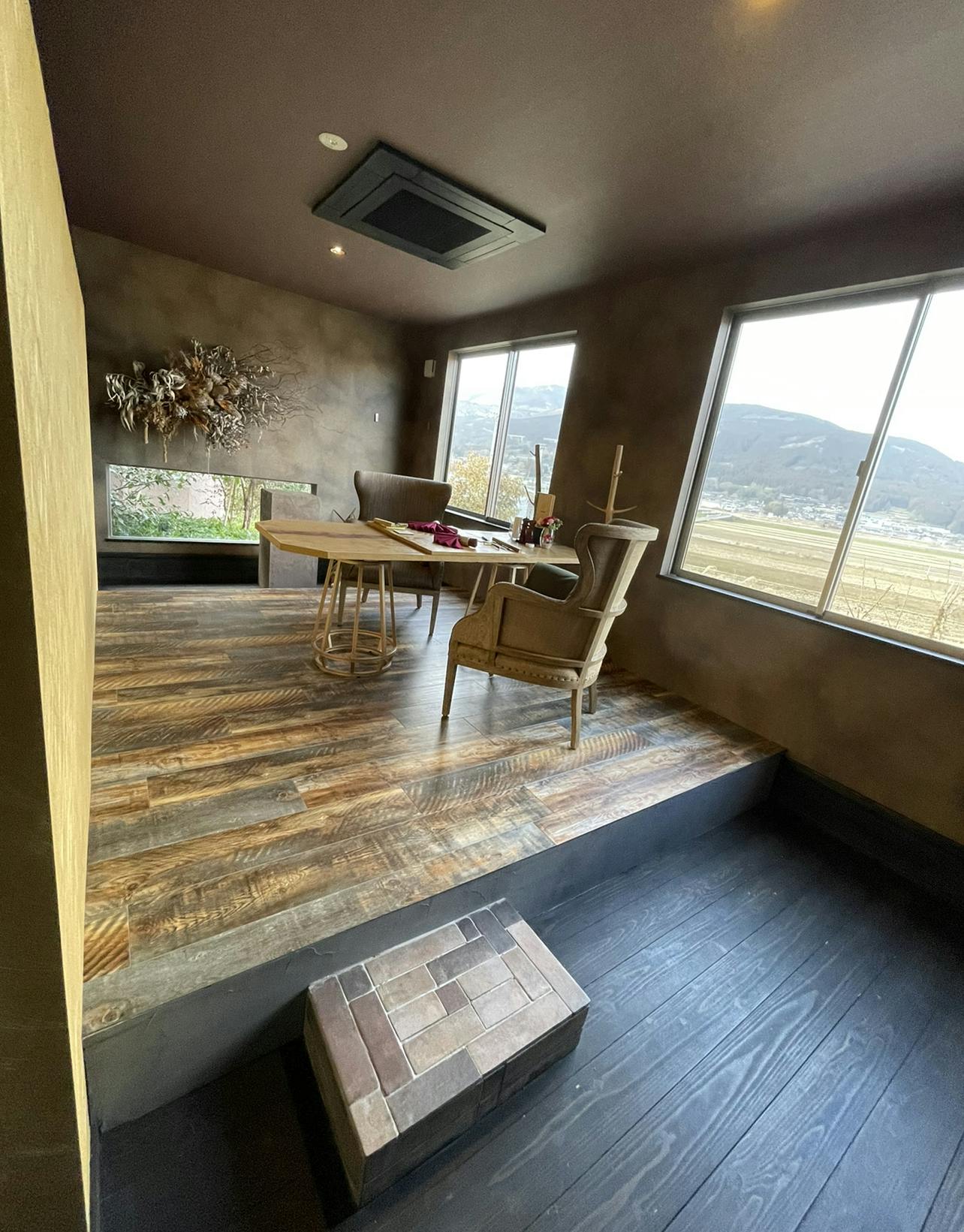 zakuroのオーナーが「蘭鋳」を訪れる人のためだけに、家具や調度品を誂え、厳選したという。家具や調度品がとても洗練された大人な雰囲気を醸し出している。そして窓の外に広がるのは、穏やかな田園風景と由布岳。