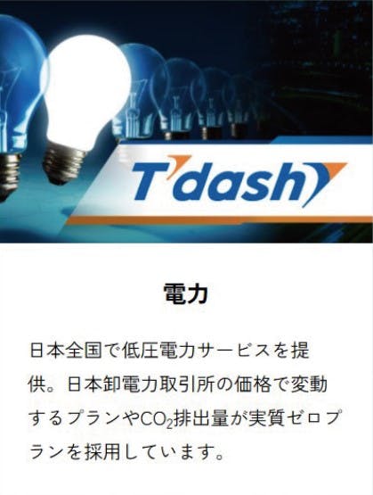 電気代の支払先に地域の大手電力会社から変更して「Tdash(ティーダッシュ)」を選んでいただきます。電気の質や検針システムなどはそのままに(工事不要)請求内容などはマイページで過去にさかのぼっていつでも閲覧することができるようになります。