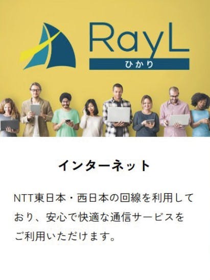 「RayL(レイル)」のインターネットは光回線を利用した高速接続です。一般的な光回線のインターネットと質的にも料金的にも変わりません。
