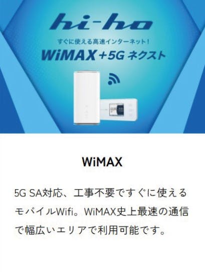 「Hi-ho(ハイホー)」のWiMAXは、工事無しで使えるWi-Fiサービスです。持ち運びに便利な携帯型と、据え置き型の二種類で提供しています。最新の5Gに対応していますので、光回線にも劣らない品質でインターネットをご利用いただけます。