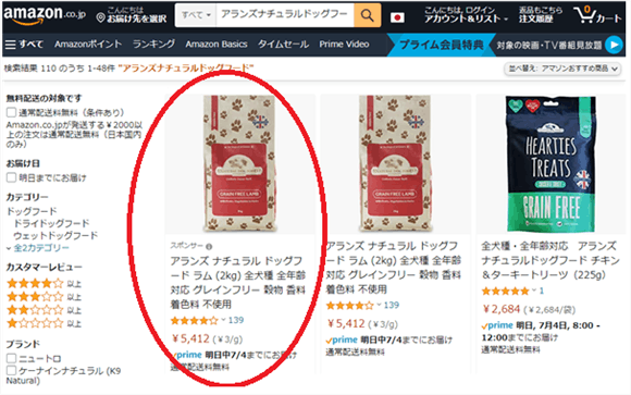 楽天だと扱ってなかったので次はAmazonで取扱があるのか見てみると検索画面ではモグワンといった他メーカーのカリカリも表示されてしまいましたがアランズナチュラルドッグフードは買えるようです。