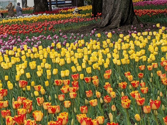 関内の横浜スタジアムは、横浜公園の中にあり、いろんな品種のチューリップが咲き誇っています。今日は平日で晴れていたこともあり、花を背景に写真を写している人がたくさんいました。