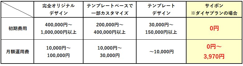 一般的なサイト制作費との比較表を作成すると、こんな感じになります。