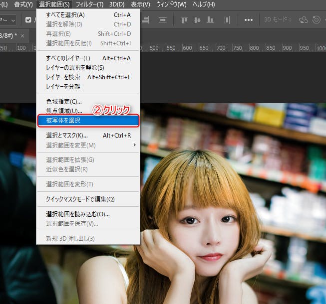 『選択範囲』→『被写体を選択』をクリック。