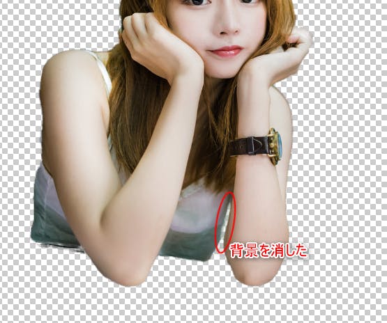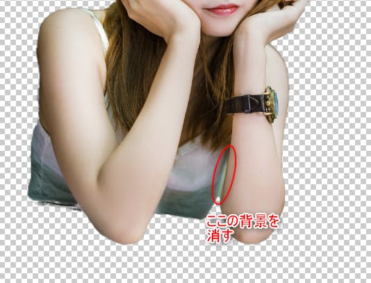 間違ったら、ctrl + Zかヒストリーから戻ればいいので。例えば、この腕と胸の隙間の背景を消してみます。
