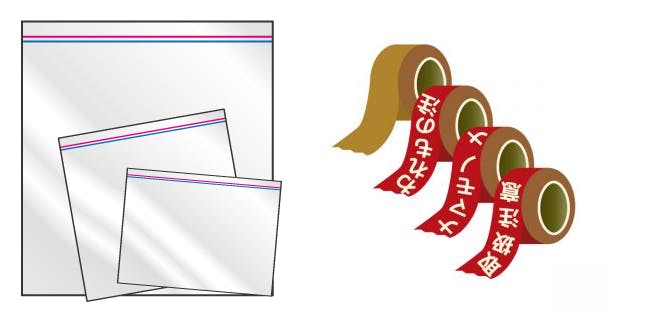 ビニール袋は、チャック付きを購入すると、セロテープなどでとめずに密閉できるので便利ですよ。ガムテープも100円ショップで購入できますし、そのほか、注意書きのシールなども売っていますので、送るものによって、買ってくるとよいとおもいます。
