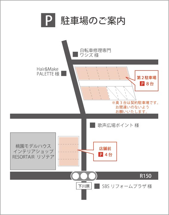 駐車場は「店舗前4台」と「第2駐車場8台」