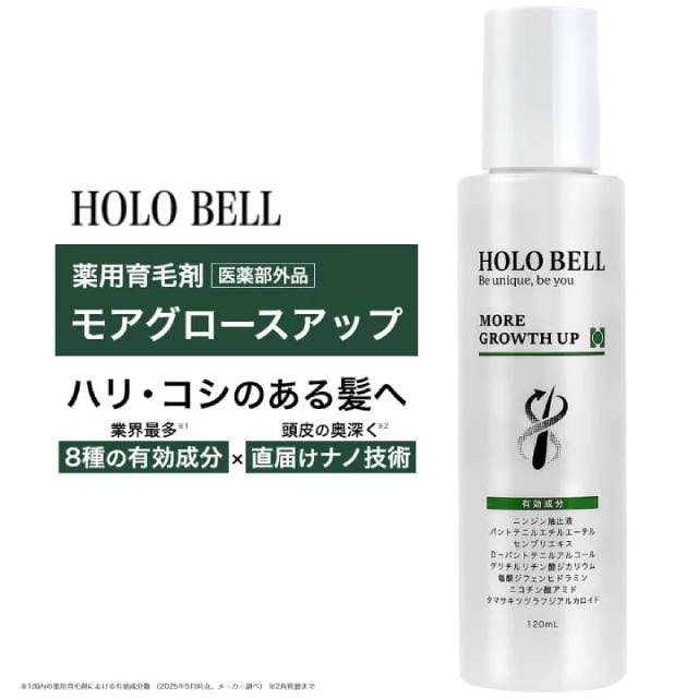 モアグロースアップは、HOLO BELL(ホロベル)から案内されている医薬部外品の育毛剤です。内容量は120mLで、公式ページでは8種の有効成分、特殊浸透技術リポソーム、ダイレクトノズル、日本初の育毛成分処方などが特徴として案内されています。