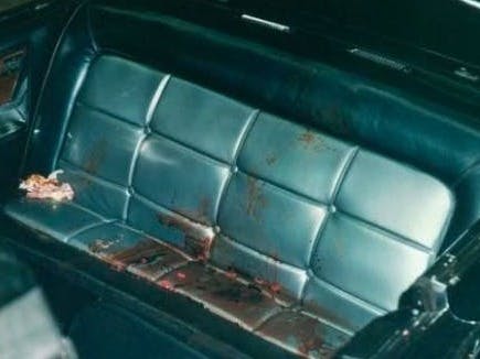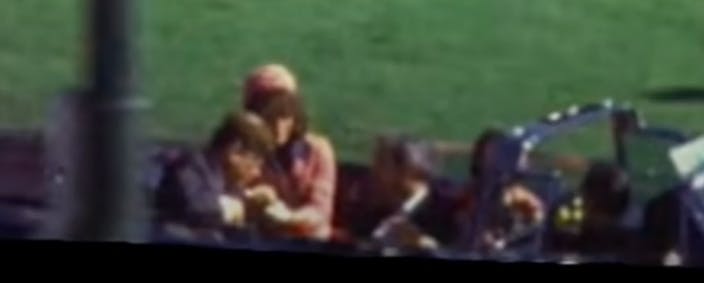 最初の画像にあるように、夫人はケネディの首に小型銃で撃ちます。それが合図となり、続いて運転手が振り返り、肩越しに大型銃でケネディをめがけて発砲しています。
