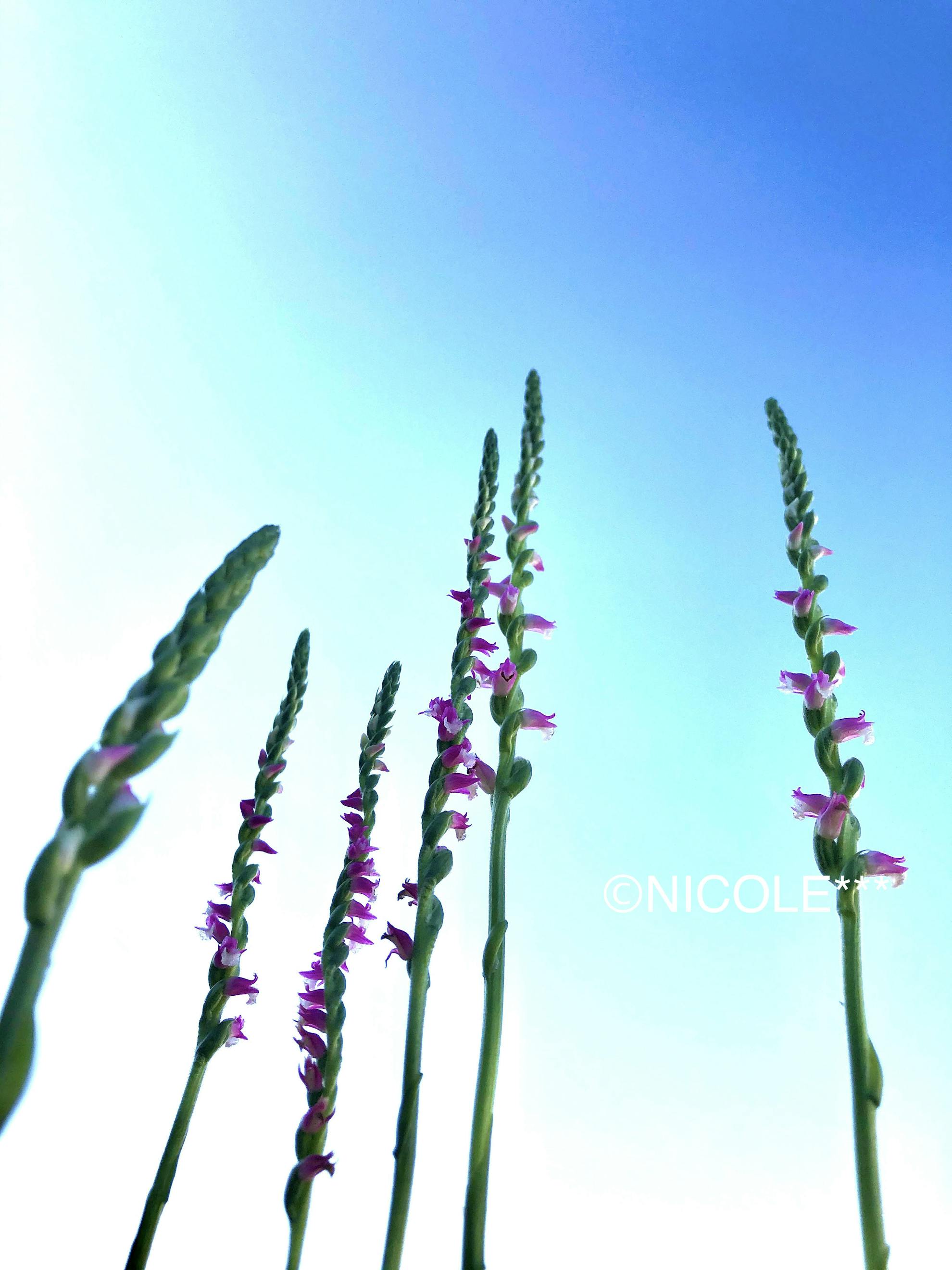 その先端に螺旋を描く小さなピンク色の花が咲いています。