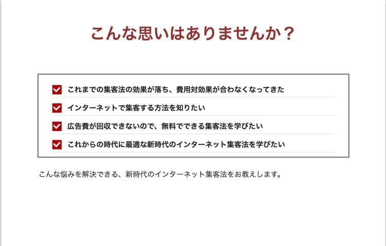 『こんな悩みはありませんか?』という形でお客さんの悩みが顕在化されているので、そこを参考にしましょう。