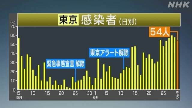 これで都内で確認された陽性者の合計は6292人となった。この日確認された陽性者54人のうち、20代と30代が49人で全体の約7割となっている。また、感染経路が不明な人は20人で29%を占めている。感染状況をチェックするモニタリング指数は、過去1週間の新規陽性者数の平均が56.9人(前日55.1人)、新規陽性者に占める感染経路不明者の割合が47.7 %(前日51%)と、休業を再要請する目安をともに超えている。週単位での陽性者の増加比が1.51(前日1.7)となっている。