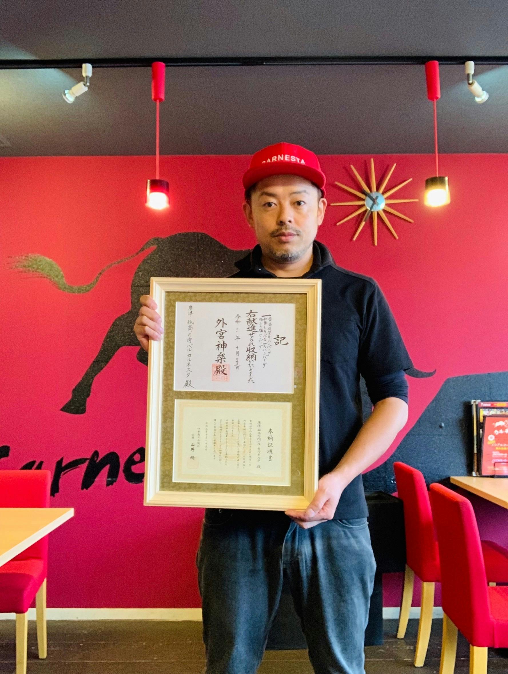 令和3年10月に”職と産業の神様”である豊受大神様の御前に、正直なものづくりを誓う宣誓書とともに、この3種のハンバーグを奉納させていただきました。