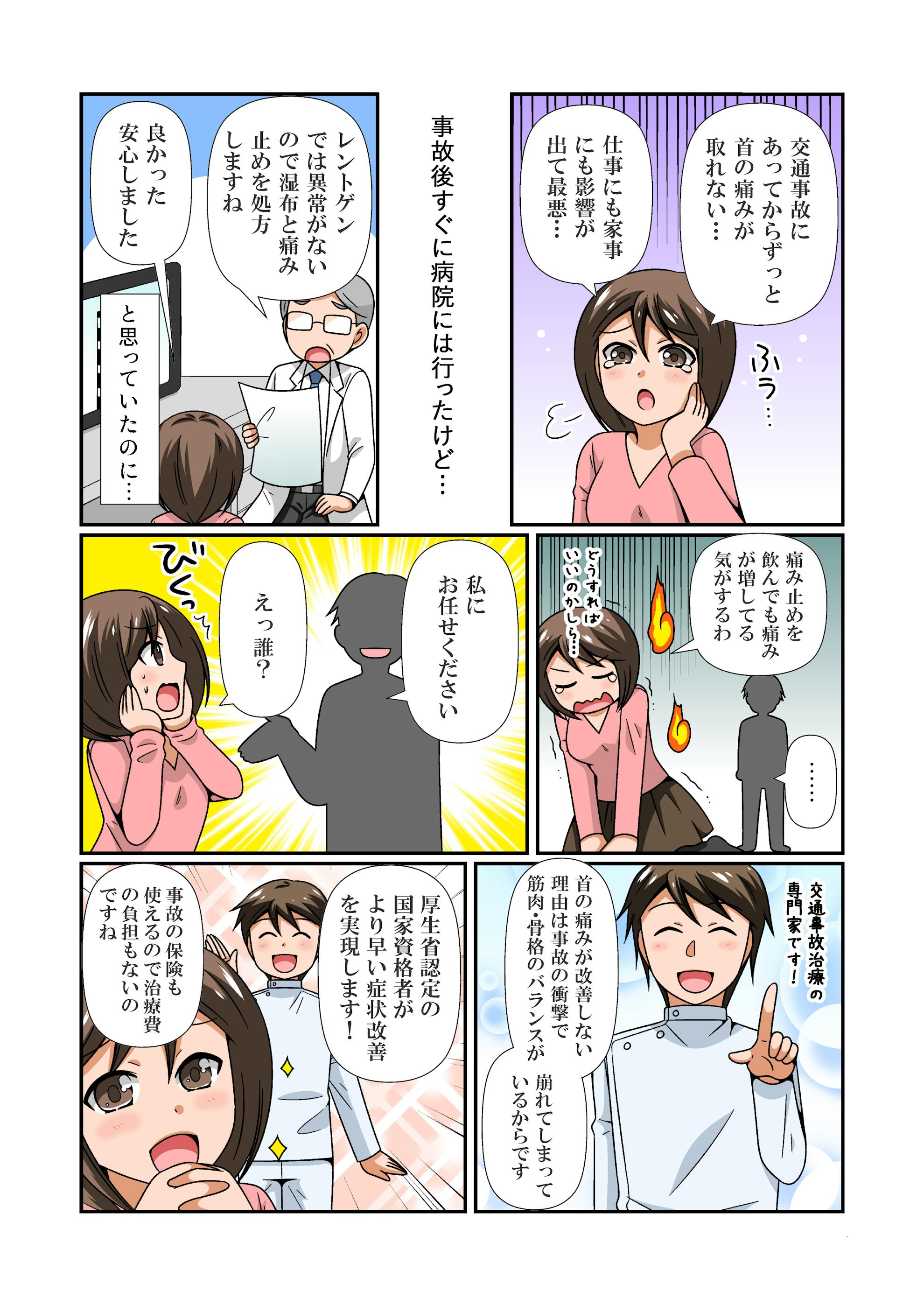 当院は治療からリハビリはもちろん、保険会社への対応、慰謝料などの補償に関するご相談、提携弁護士へのご紹介など他院に比べ交通事故に強いと自負しております。