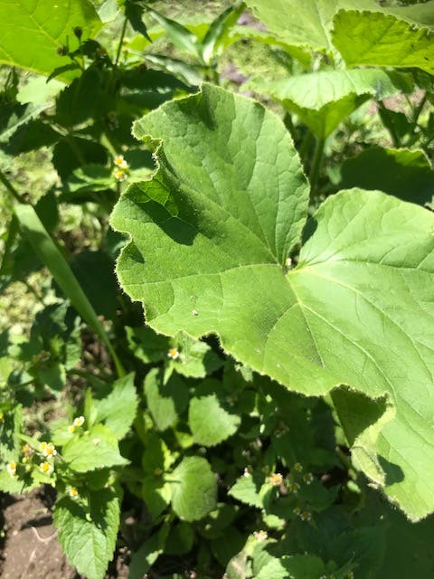 ふと見ると、雑草の中にかぼちゃ、じゃがいも、青紫蘇の葉、