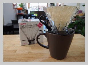 当店ではハリオのV60という器具を使って抽出しております。 じっくり抽出しますので、深みがありコクがある味に仕上がります。 V60は淹れる人によって味が変わる面白さがある器具です。
