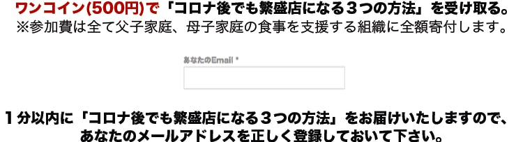 なので、今回は500円で「コロナ後でも繁盛店になる3つの方法(音声)」を提供、さらに売上全額を父子家庭、母子家庭の食事を支援している組織に、全額寄付いたします。