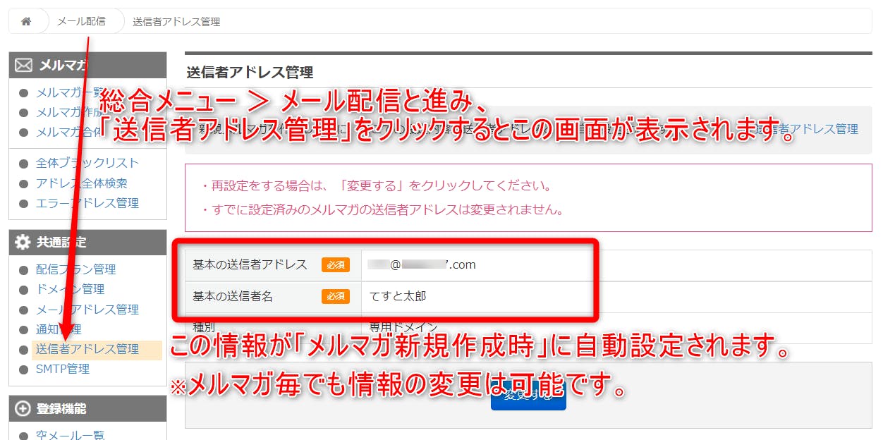 既存のメルマガの送信者情報を変更する場合は、メルマガ毎で変更を行ってください。(詳細は