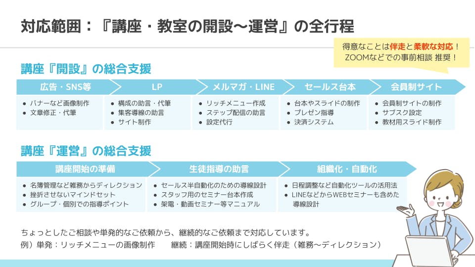 クライアントワークで『講座開設~運営』の全行程に対応しています。