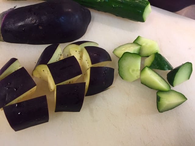 ニンニクは皮をむいて包丁の腹でぐしゃっと潰して芽を取ります。
