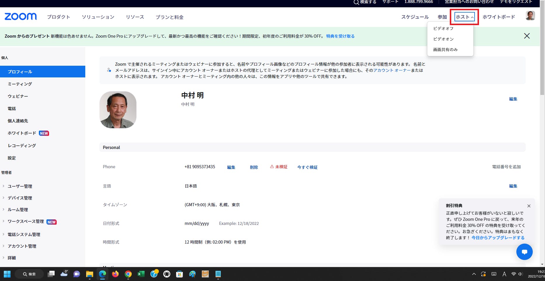 自分のZoomのプロフィール画面を開いて、上にある「スケジュール」をクリック