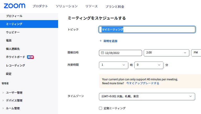 そこで、トピック、説明、開催日時、所要時間、タイムゾーン、ミーティングパスワード、ビデオ、ミーティングオプションの各項目を入力します。
