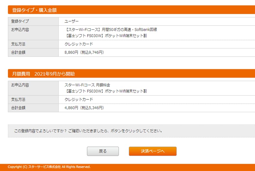 下の画面は【スターWi-Fiコース】をユーザーで申し込んだ場合です。