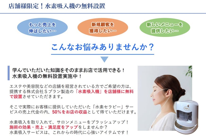 機器無料設置、サプリや吸入サービスの売り上げに対して手数料をお支払いします。