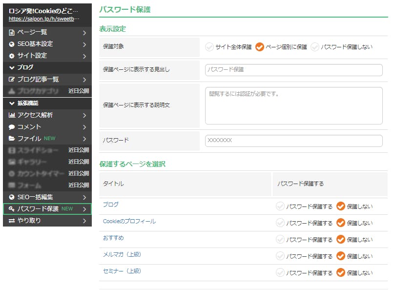 サイト全体にパスワードをかけることも、ページごとに設定することも可能です♪
