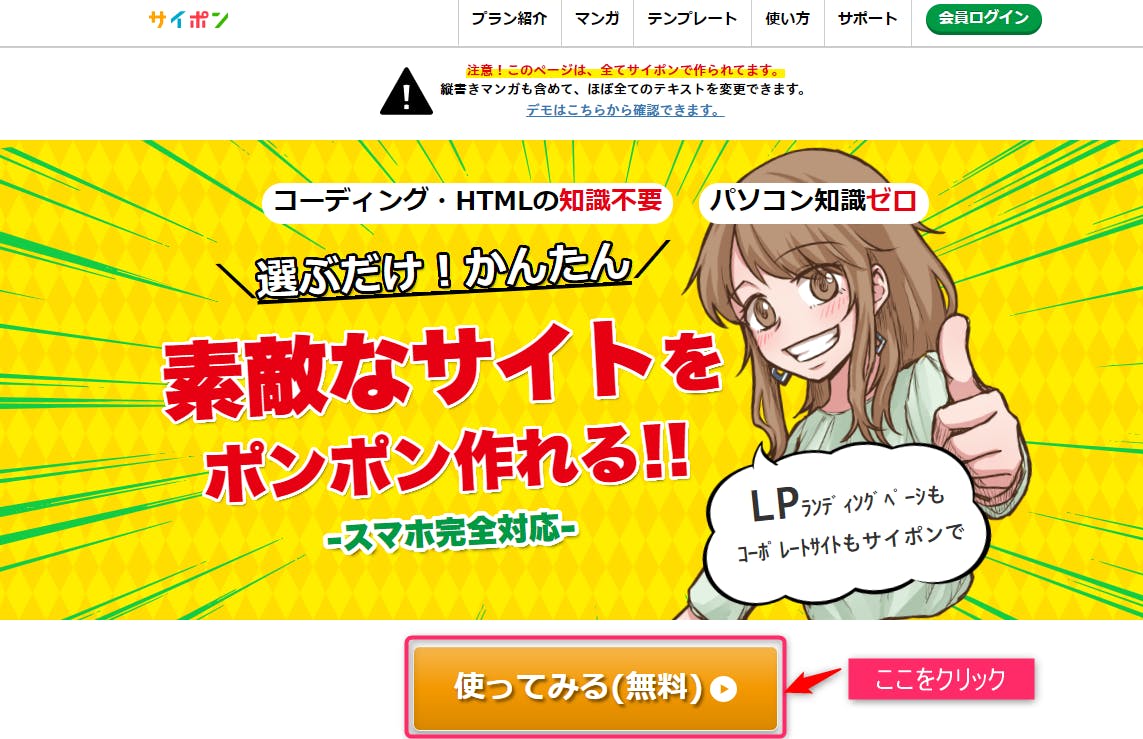 サイポンのトップページに飛んだら、”使ってみる(無料)をクリックします。