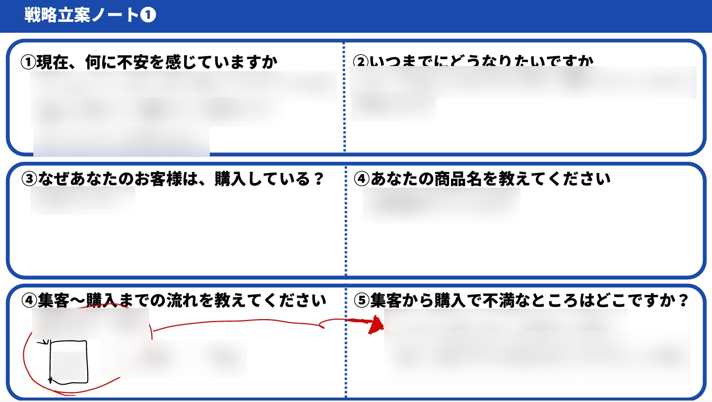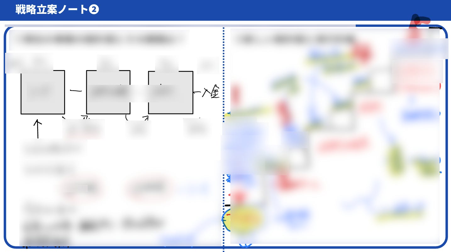 頭の中だけで戦略を考えるよりも、紙とペンを使って思考や会話を整理した方が、よい明確で効果的なプランを作ることができます。なので、本セッションをより濃密な時間にしていくために「戦略立案ノート」というワークシートを受講者の方にはお送りしています。