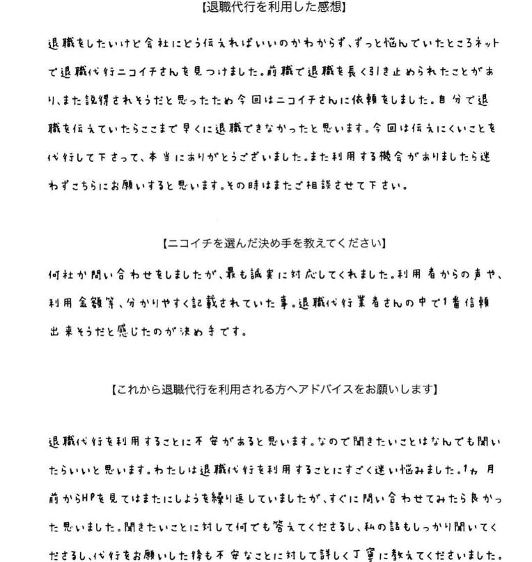 実績が多いということは、それだけ多くのケースに対応してきたということ。つまり、退職代行ニコイチには、退職に関するさまざまな状況でどう対応すればいいのか、豊富なノウハウがあるってわけです。何千、何万という人たちの退職をサポートしてきた経験は、ニコイチがどんな退職の悩みにも対応できる力を持っていることの証しですよね。