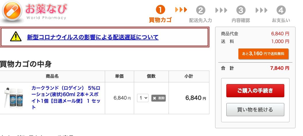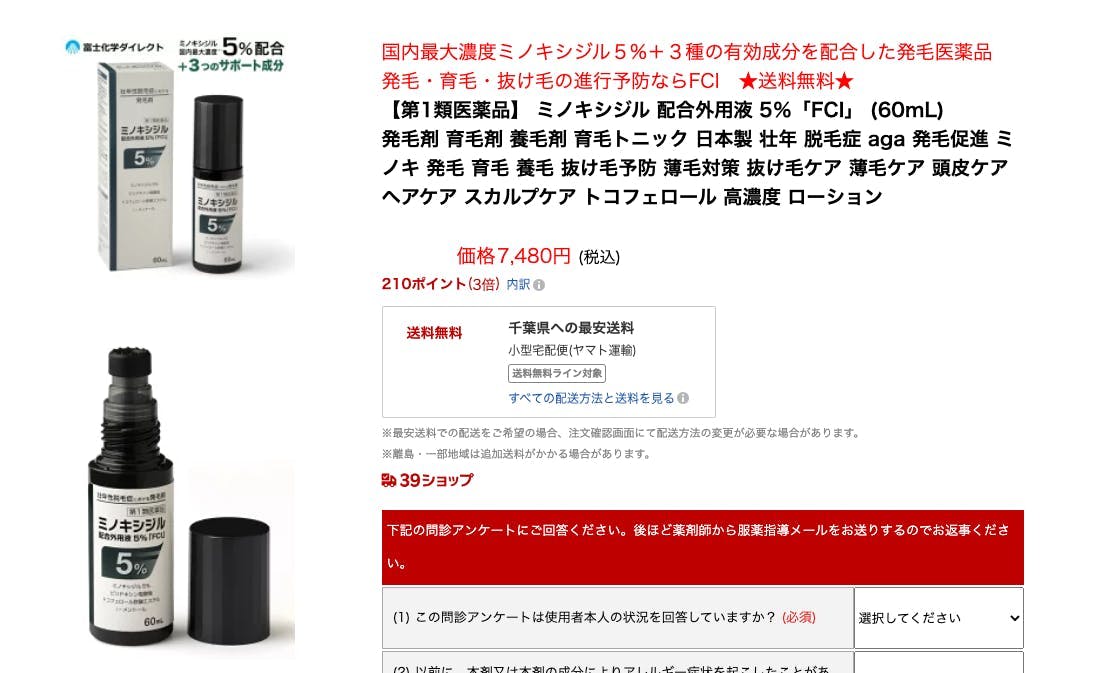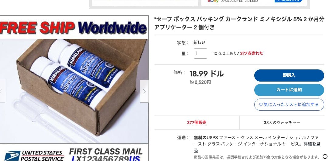 こちらは海外発送の、ミノキシジル2ヶ月分。7840円で販売されてます。