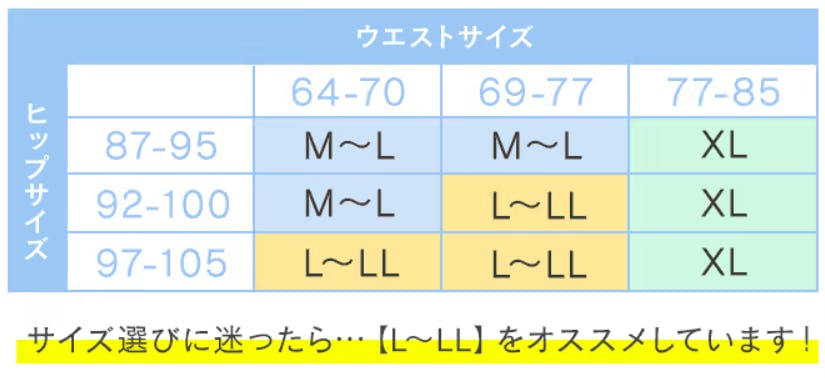 ここでのポイントは、自分の測定サイズがキュリーナのどのサイズ範囲に当てはまるかを確認すること。例えば、通常服のサイズがMサイズの方でも、お腹周りやヒップサイズによっては「L~XL」や「XXL」が適切な選択肢になることもあります。