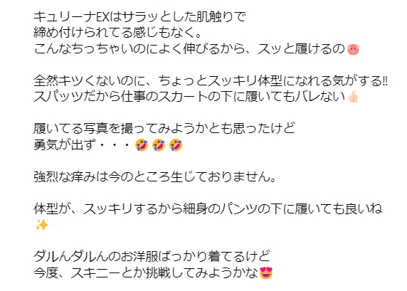 そんなとき、少し大きめのサイズを選ぶことで、快適さを保ちつつ、キュリーナの持つスタイルアップ効果を体験できるんです。大きめのサイズでも、キュリーナ独自の着圧設計のおかげで、しっかりとしたサポート感は保たれます。