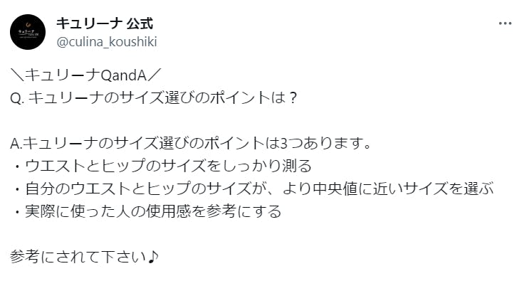 キュリーナを選ぶ際には、ただ自分の通常のサイズを選ぶのではなく、実際の体のサイズとキュリーナのサイズ展開をきちんと照らし合わせることが大切です。そうすれば、快適で美しいスタイルを手に入れることができるでしょう!