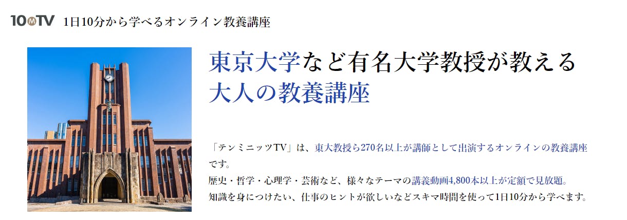 テンミニッツTVは、忙しい社会人のための画期的なオンライン学習プラットフォームです。短時間で効率的に学べる工夫や、一流講師陣によるハイクオリティな講義コンテンツが魅力。さらに、幅広いジャンルを網羅しているので、自分の興味や目的に合わせて学びを深められるんです。