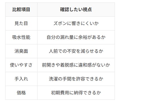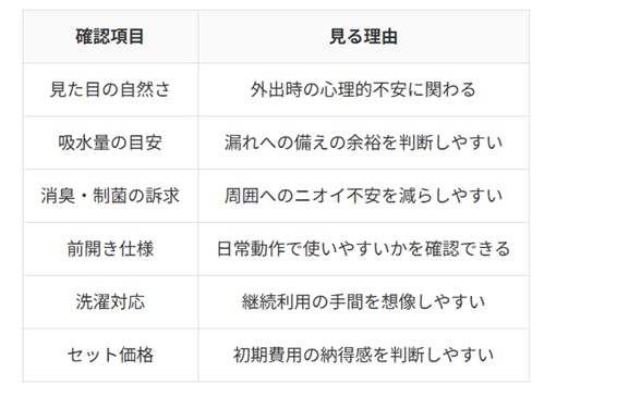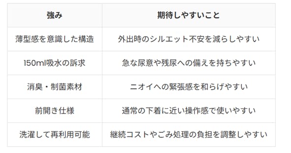 公式が示す特徴は商品の強みを理解するうえで役立ちますが、それだけで自分の生活に合うとは限らず、着用時間、尿漏れの頻度、洗濯環境、季節による蒸れやすさなど、使う条件まで考える必要があります。