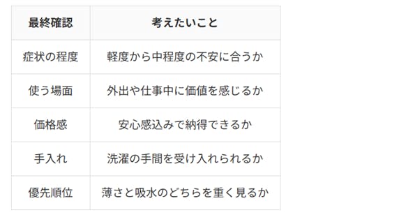 とくに尿漏れ対策用品は症状の程度や悩みの深さに個人差が大きいため、口コミの数よりも、自分が困る場面と商品の設計意図が一致しているかのほうが満足度に影響します。