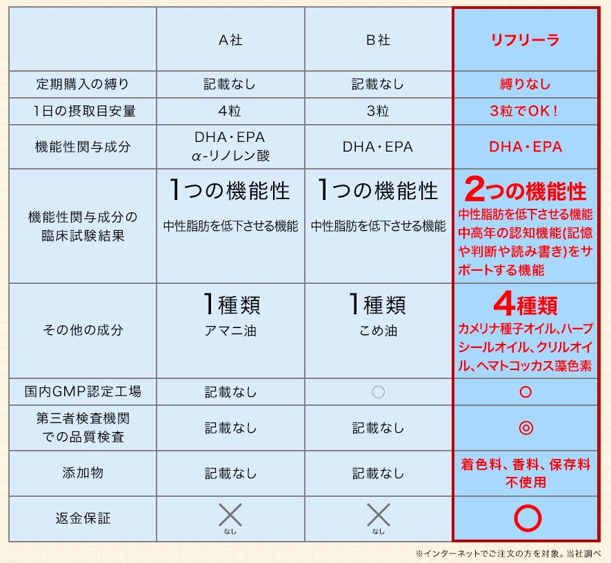 飲むオメガ リフリーラと他社サプリメントの比較についてですが、これは公式の方で図が掲載されています。