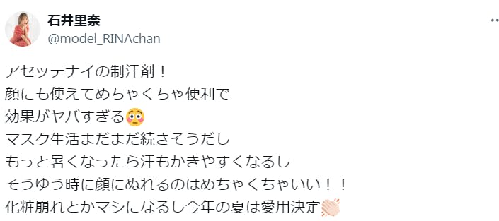 アセッテナイで、汗やニオイの悩みから解放されること間違いなしですよ!