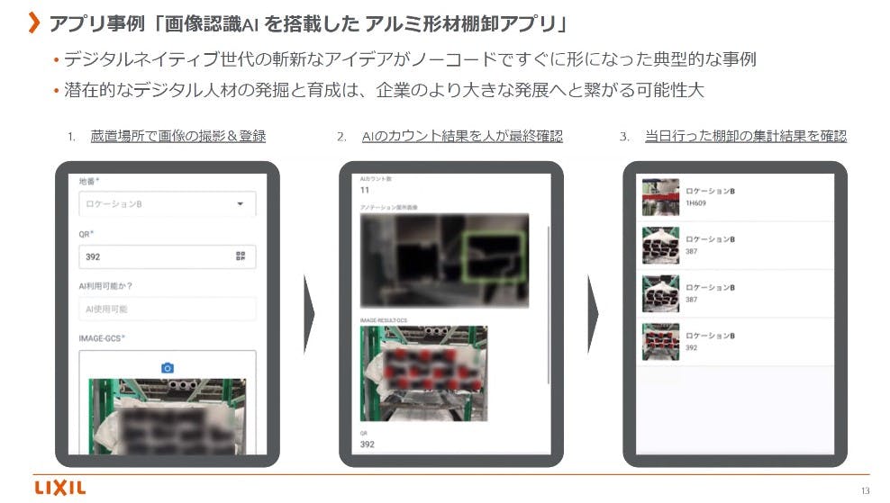 WBSが放送していたのは、現場で作ったアプリケーションの1つが、アルミサッシの型材の個数を画像認識でカウントするアプリケーションである(下図)。現場で型材の写真を撮影し、アップロードすることで、画像認識AIを使って個数をカウントし、個数を表示するアプリケーションである