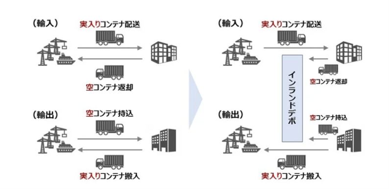 そこにモーダルシフトと海上コンテナのインランドコンテナデポ【下図のコンテナラウンドユース参照】とオンドックレール【下図のは絶対条件だと思うが、なぜ10年構想に入っていないのか
