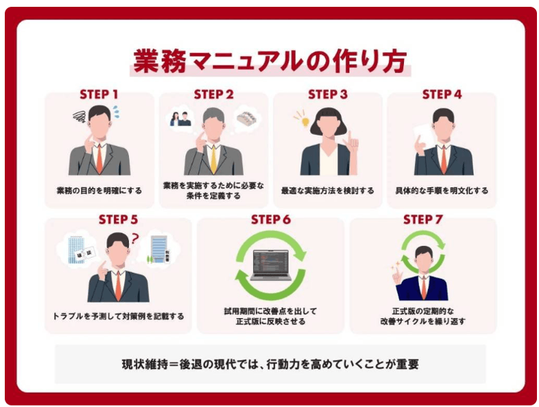 業務マニュアルはその業務を行う人が、改定しやすいように、見やすいように、現場に置くこと