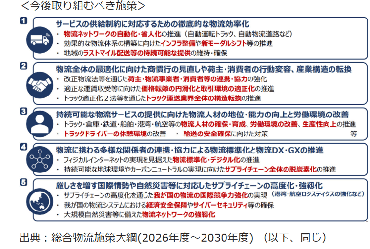 次期「物流大綱」が目指すべき今後の物流政策を、下記の5つの観点に分類し、国のみならず、物流 事業者、発着荷主、一般消費者をはじめとした物流に携わるすべての関係者が一致団結して、物流の未来を切り拓く更 なる飛躍の5年間となるよう、責任と覚悟を持って、一気呵成に施策を推進。