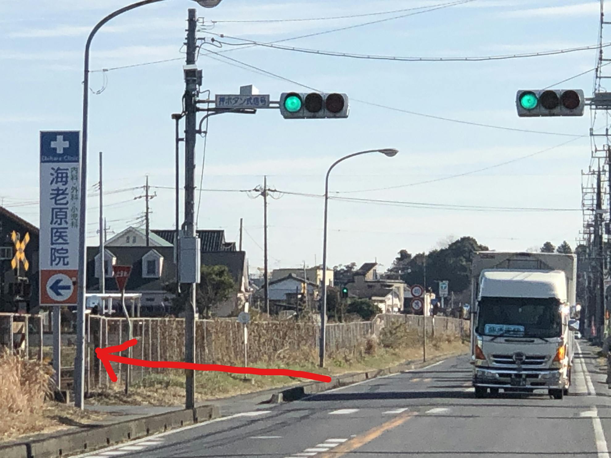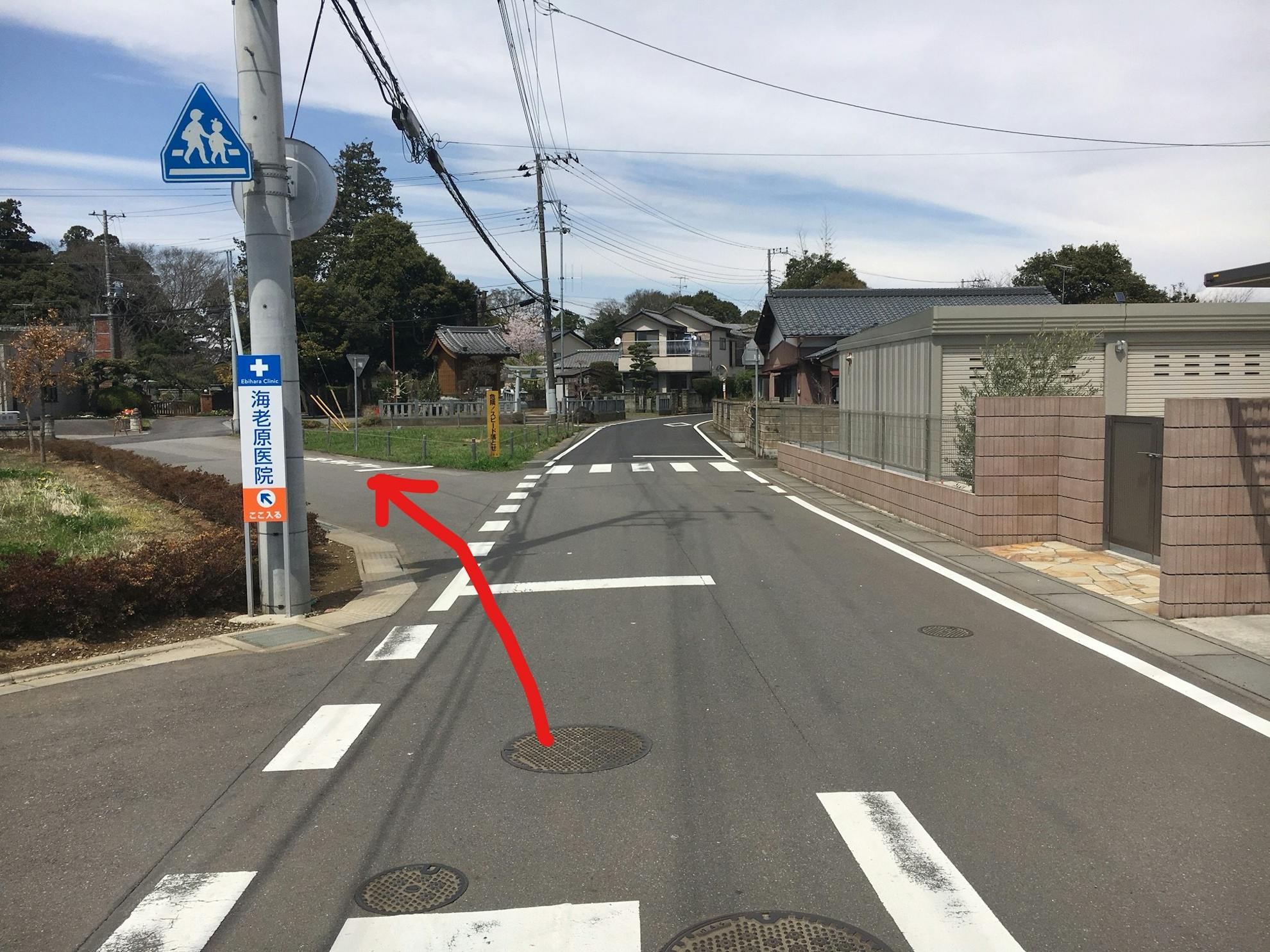 左側に「海老原医院」があり、右側に駐車場がある間の細い道を直進してください