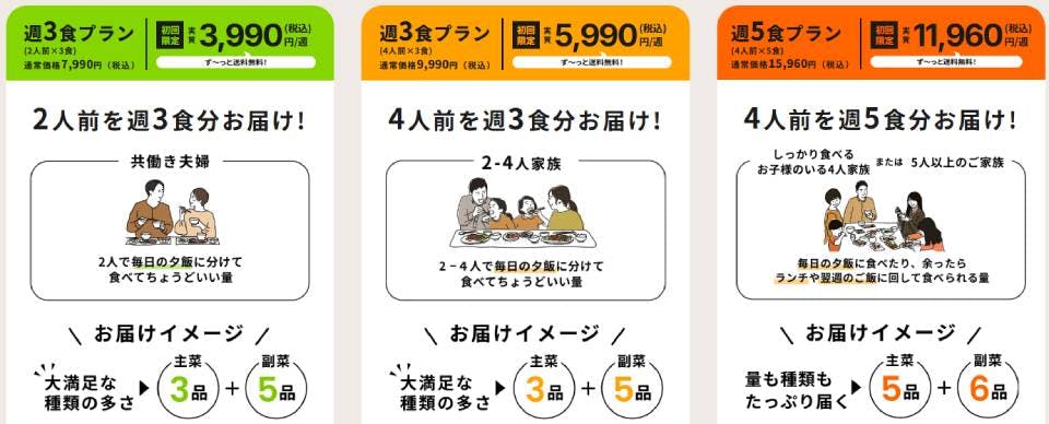 公式サイトでは、世帯人数や食数に合わせて選びやすい3つのプランが案内されていて、それぞれ通常価格と初回限定価格が表示されています。