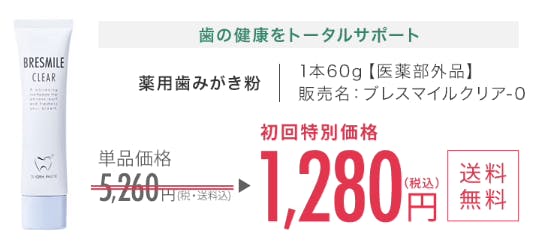 公式ページで初めてブレスマイルクリアを通販される一世帯1セットの特別価格として、通常1本5,260円するところ3,980円引きとなる1,280円で買えるんです。
