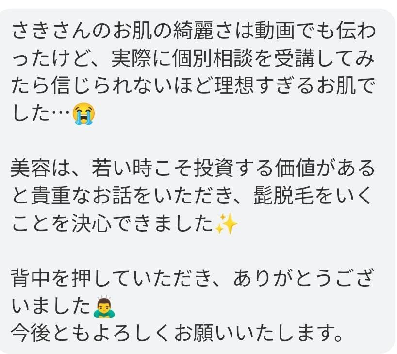 個別コーチングセッションでは、さきが「合計100万円」をかけて体験した美容医療と「5年以上の時間」をかけ、実践と失敗を繰り返して気付いた "本物の肌質改善" を、オンライン若返り法コーチング体験として提供いたします。時間は1時間を予定しています。
