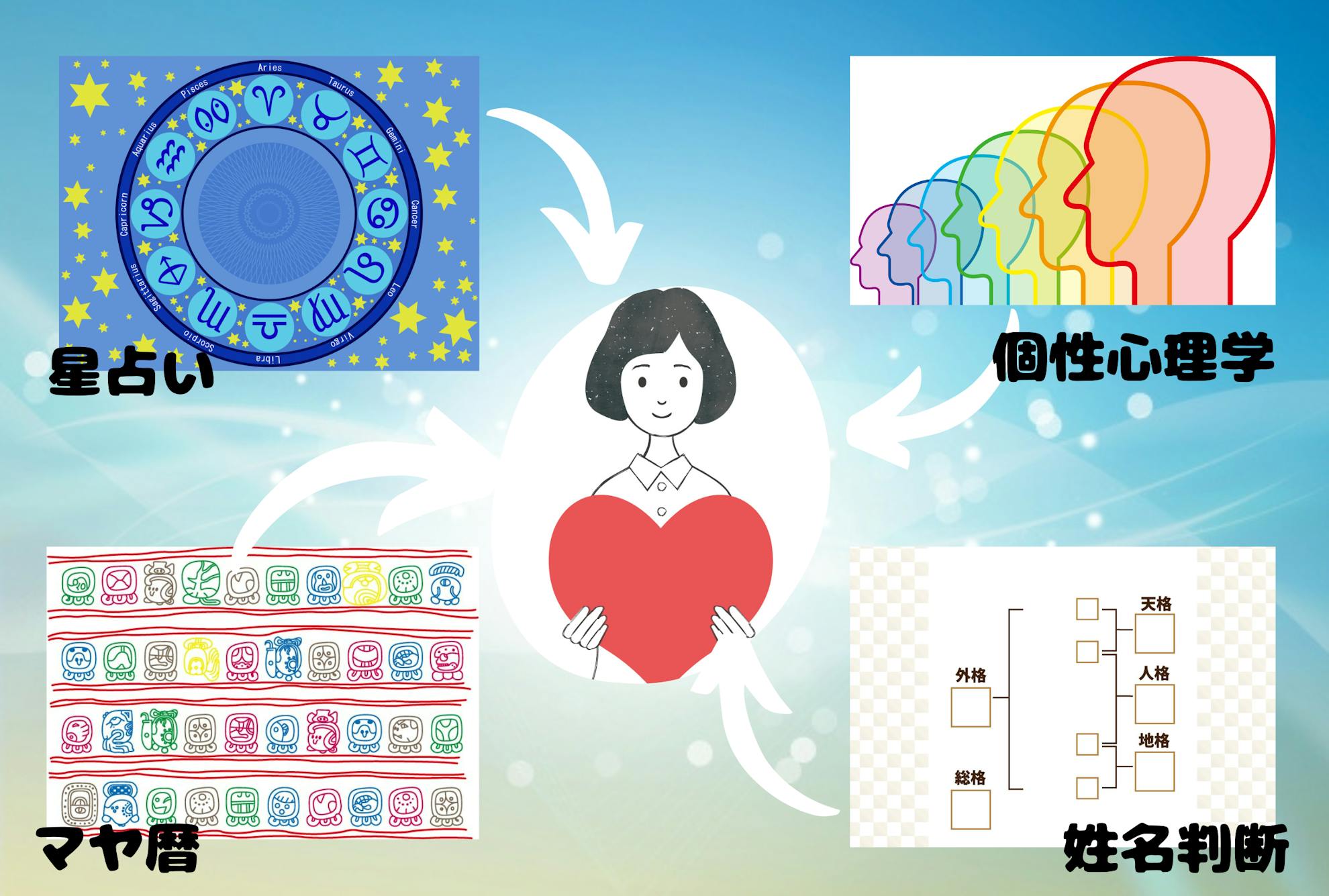 顕在意識の太陽星座と潜在意識の月星座で自分を知り、マヤ暦や、個性心理学で自分の特性や相性をみていく。さらには姓名判断で今の運勢を見るだけでなく開運ポイントまでアドバイス!